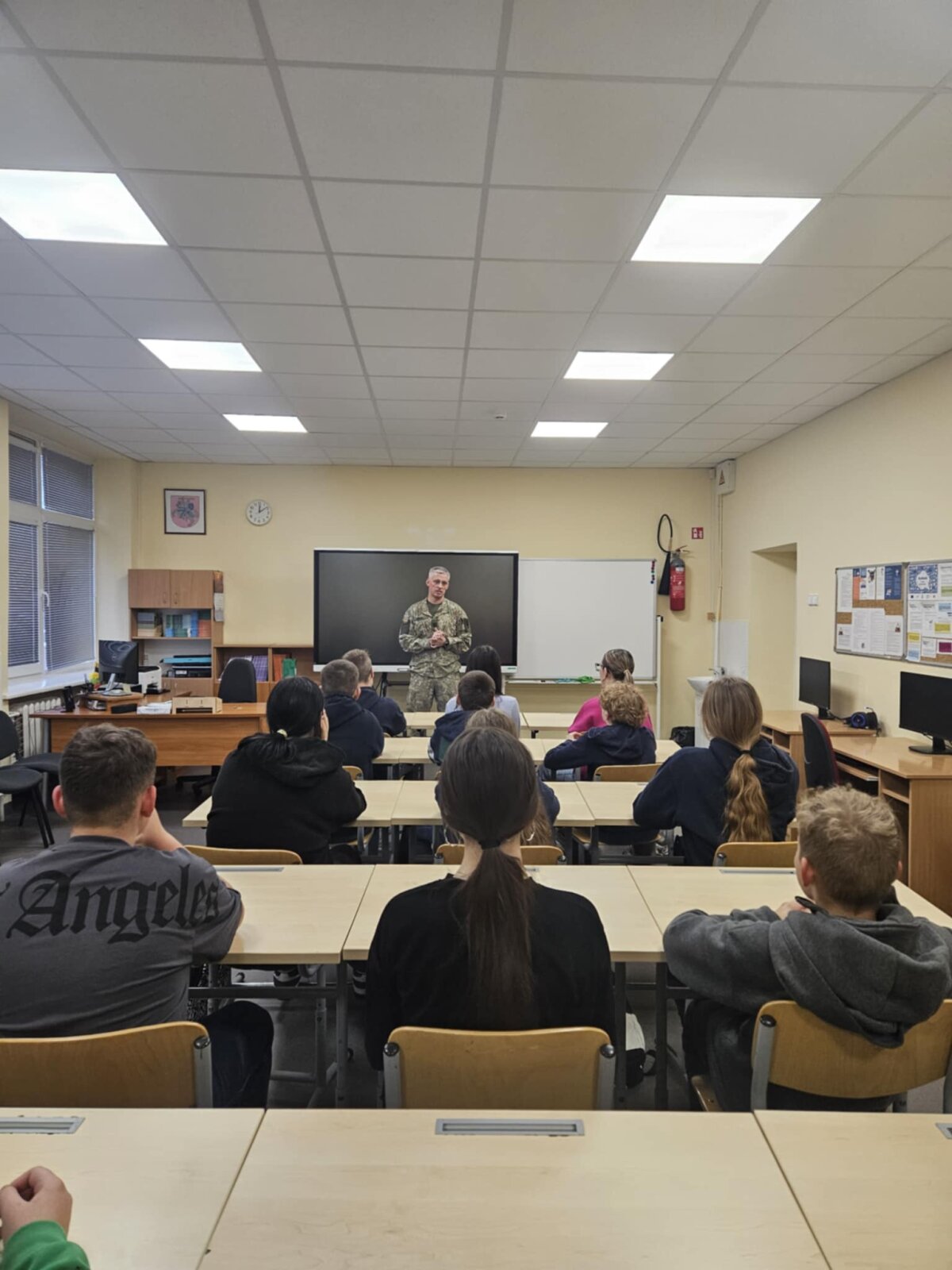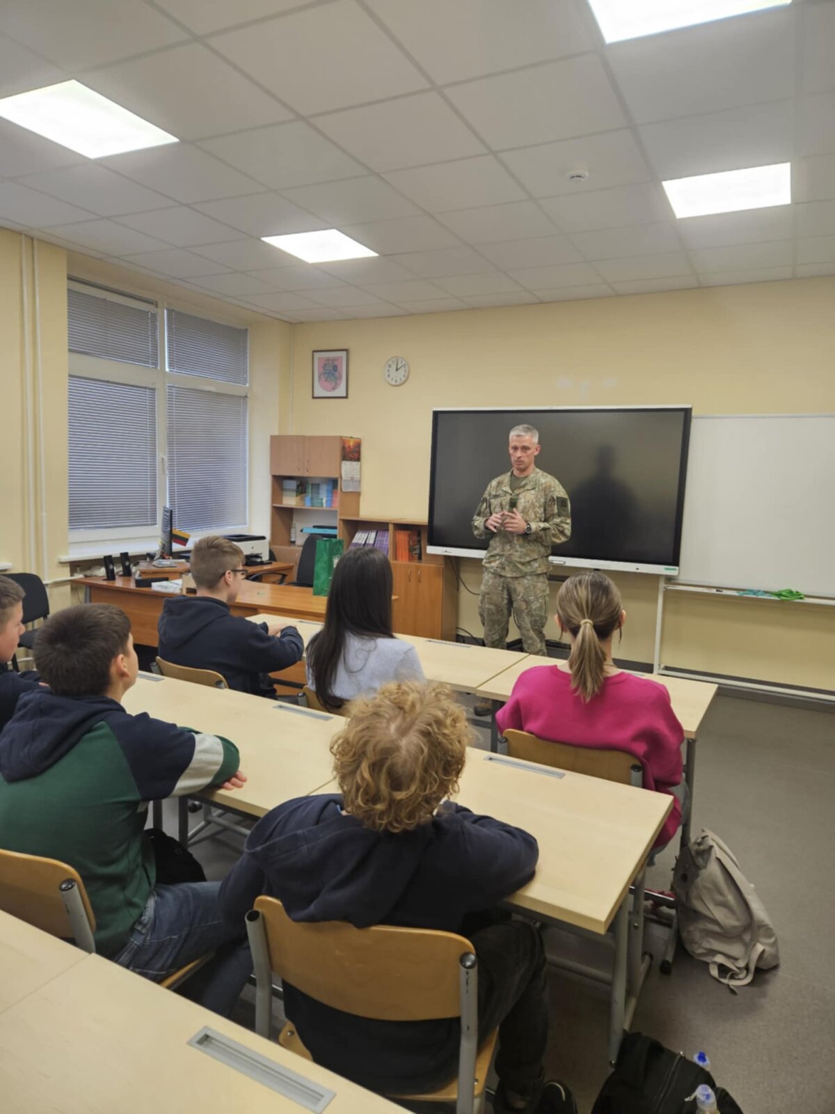 Lapkričio 23 d. minima Lietuvos kariuomenės diena. Taip jau sutapo, kad lapkričio 25 d. mokykloje viešėjo Jonavos Karo prievolės ir komplektavimo skyriaus atstovas vyresnysis seržantas Žygimantas Jarukas. Tarnybos karininkas mokiniams pristatė karininko profesiją. Dėkojame svečiui už įkvėpimą ir galimybę išbandyti save – galbūt šiandien čia žengti pirmieji kažkieno būsimo karininko žingsniai.