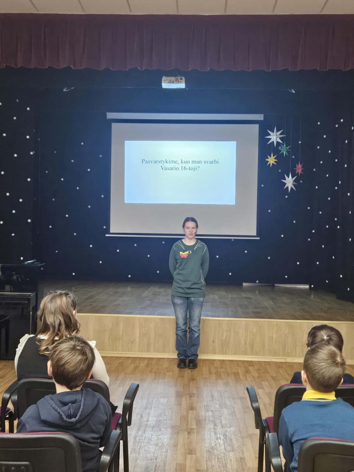 užduotis, svarstė, kuo Vasario 16-oji svarbi kiekvienam iš mūsų, atliko paruoštą meno programą.
