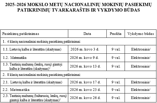 2025–2026 mokslo metų nacionalinių mokinių pasiekimų patikrinimų tvarkaraštis ir vykdymo būdas