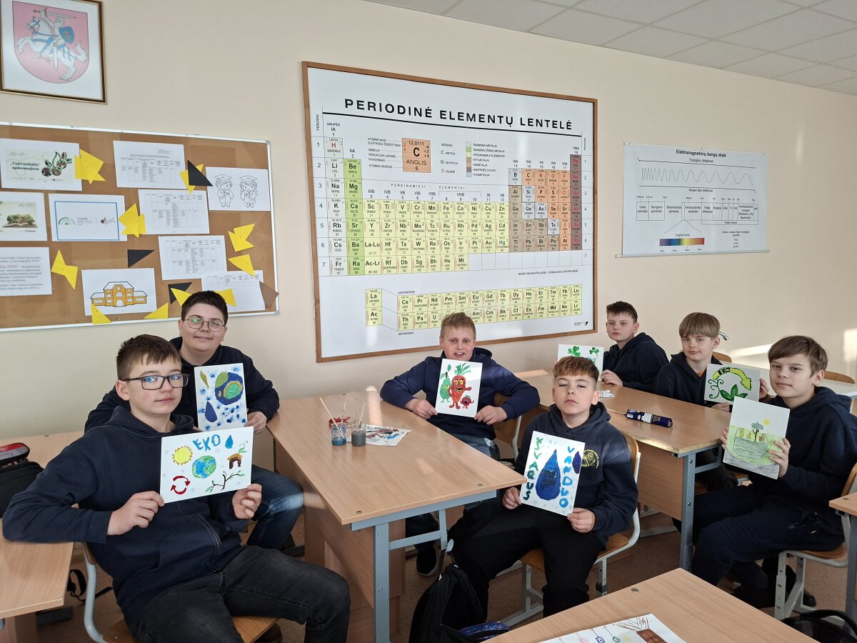 Kovo 16–18 dienomis 5 klasės mokiniai kartu su neformalaus ugdymo „Žaliasis klubas“ nariais gilinosi į ekologines problemas: atliekų rūšiavimą, vandens taupymą, energijos vartojimą ir gamtos išteklių tausojimą. Aptarę šias temas, mokiniai kūrė ekologotipą – aiškų, informatyvų ir lengvai atpažįstamą vizualų ženklą.